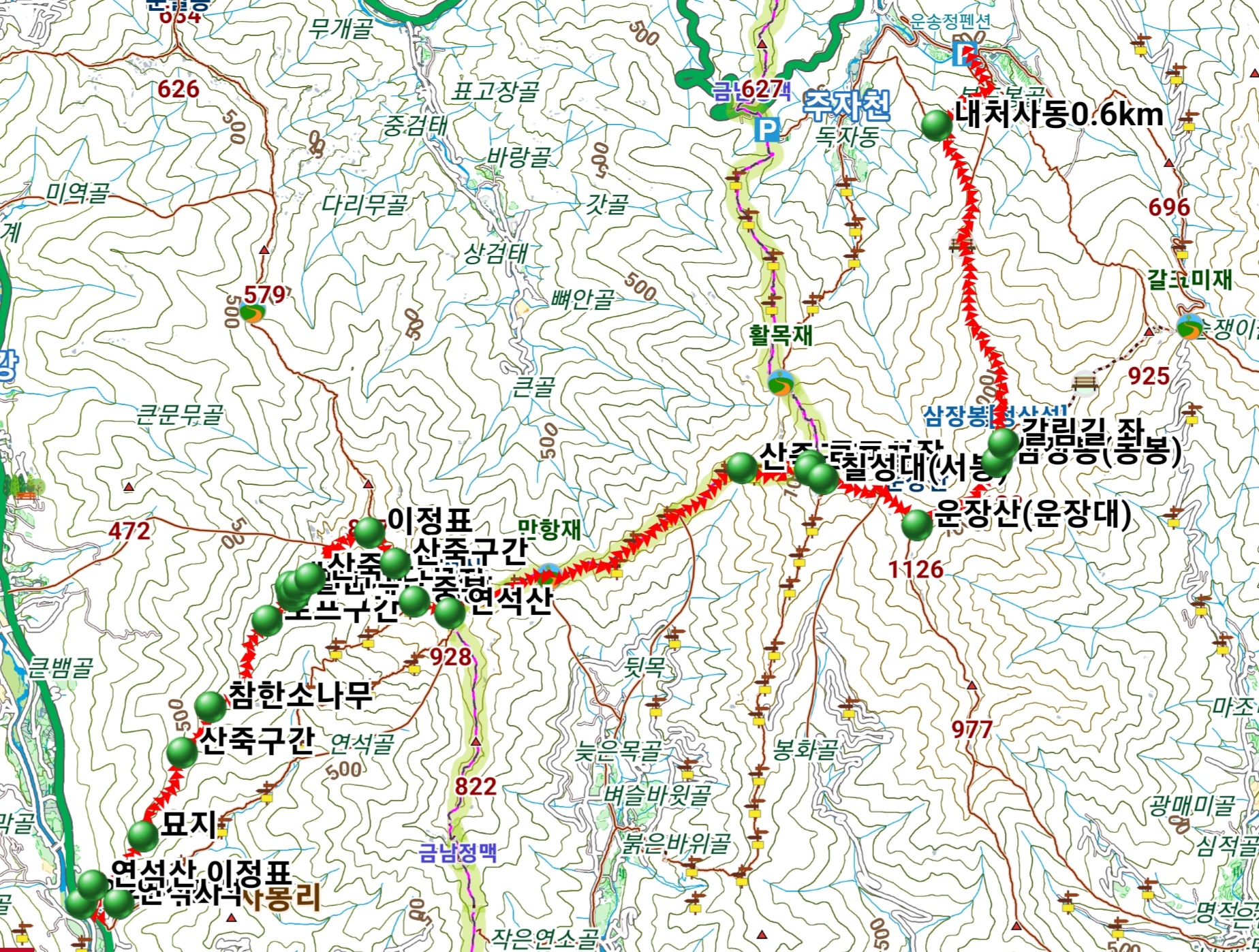 * 산행코스 :연동마을주차장-연석사-병풍바위-중봉-연석산-만항재-칠성대(서봉)-운장산(운장대)-삼장봉(동봉)-내처사동